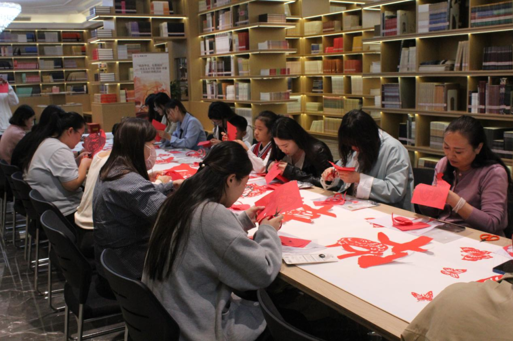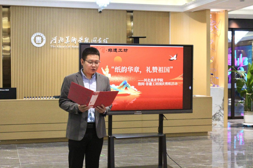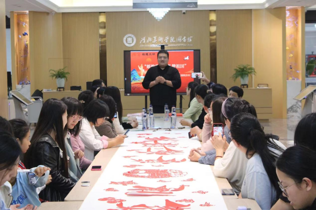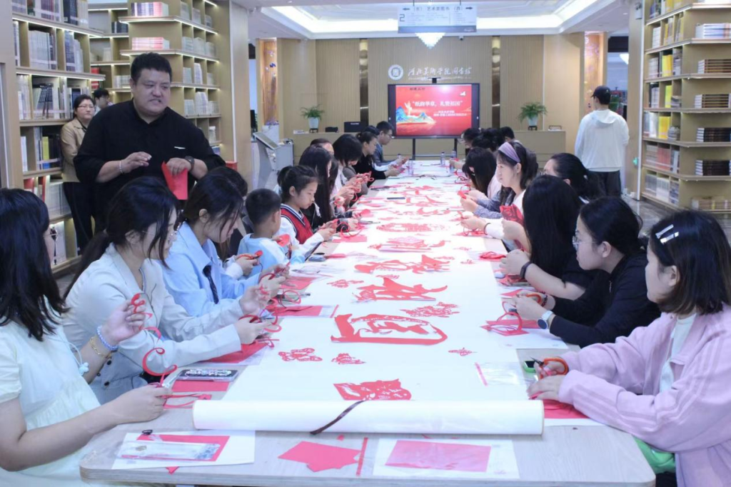为庆祝中华人民共和国成立76周年,弘扬中华优秀传统文化,9月27日上午,河北美术学院指间·非遗工坊成功举办了“纸韵华章,礼赞祖国”国庆主题剪纸活动。本次活动将非遗技艺与爱国情怀相融合,在方寸红纸间镌刻时代华章,以独特的方式为祖国献上深情祝福。石家庄市民间文艺家协会主席王律一行,行唐剪纸代表性传承人赵成龙,石家庄市青少年书画家协会副会长程英哲,我校图书馆馆长李世新,设计学院副院长孙文琰,工坊指导老师、设计学院非遗教研室主任唐景词,图书馆老师白莉等其他师生代表参加了本次活动。活动由图书馆馆长李世新主持。