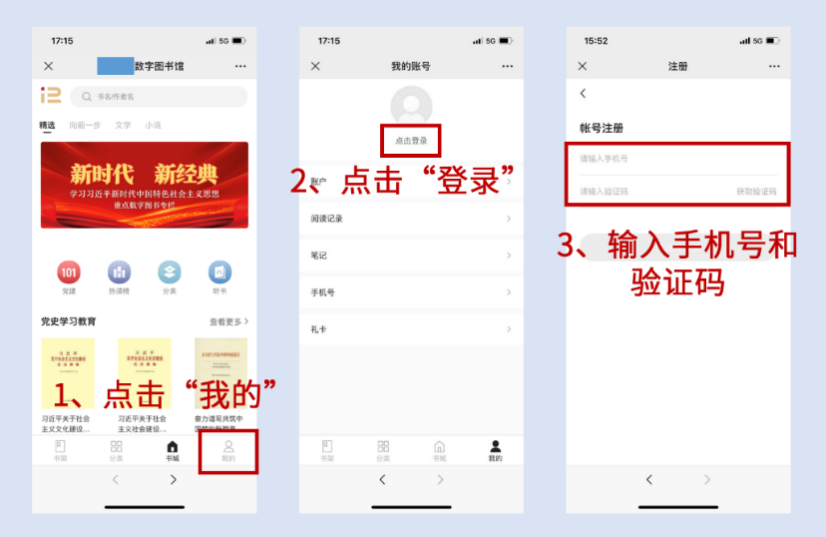 点击“我的”进入登录界面,点击中间登录,输入手机号+验证码(这一步骤会有地理位置权限授权,请点击“允许”),登录成功后可阅读书城书籍。