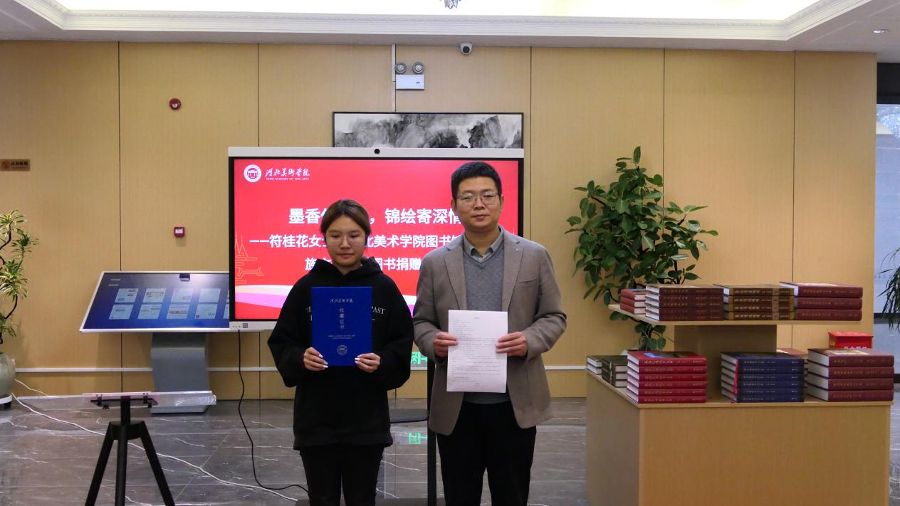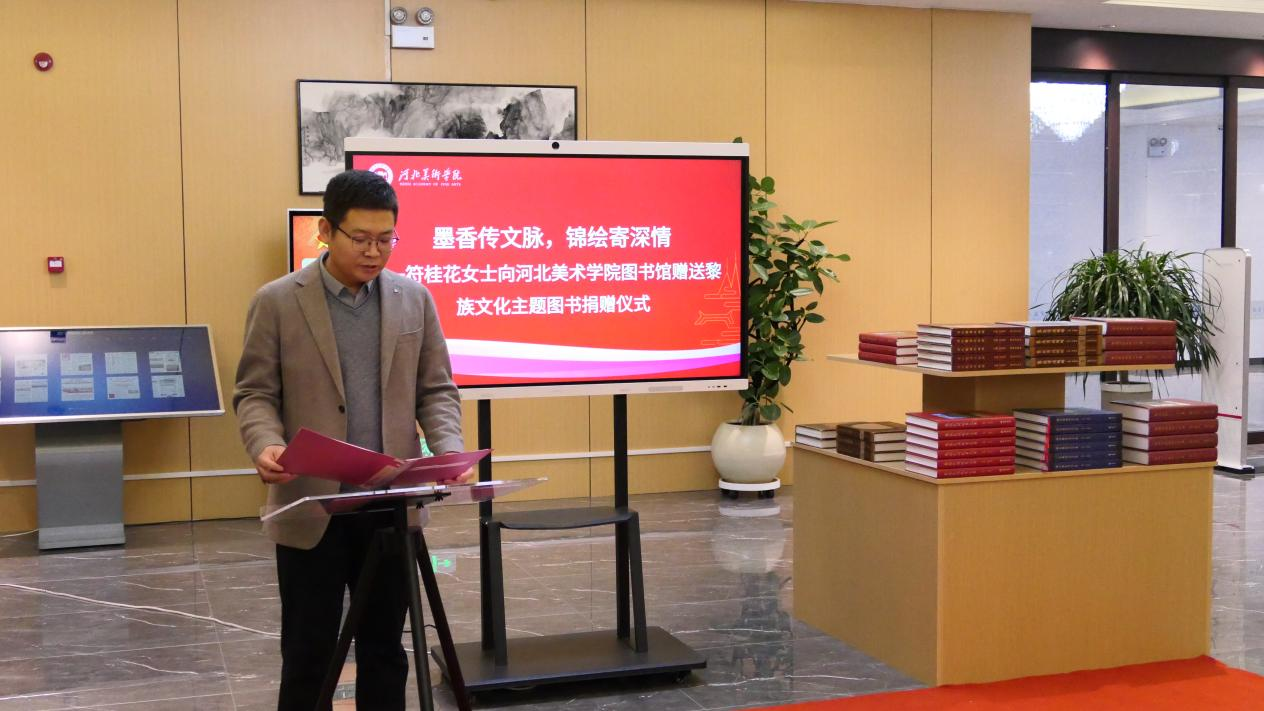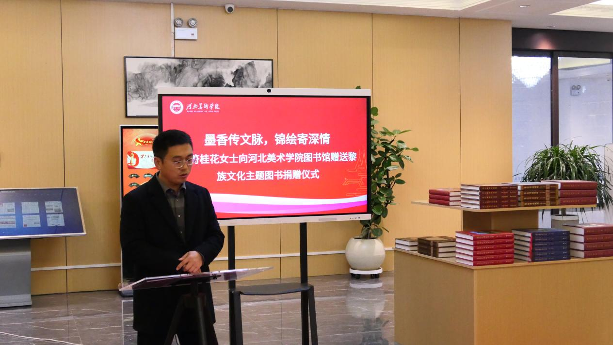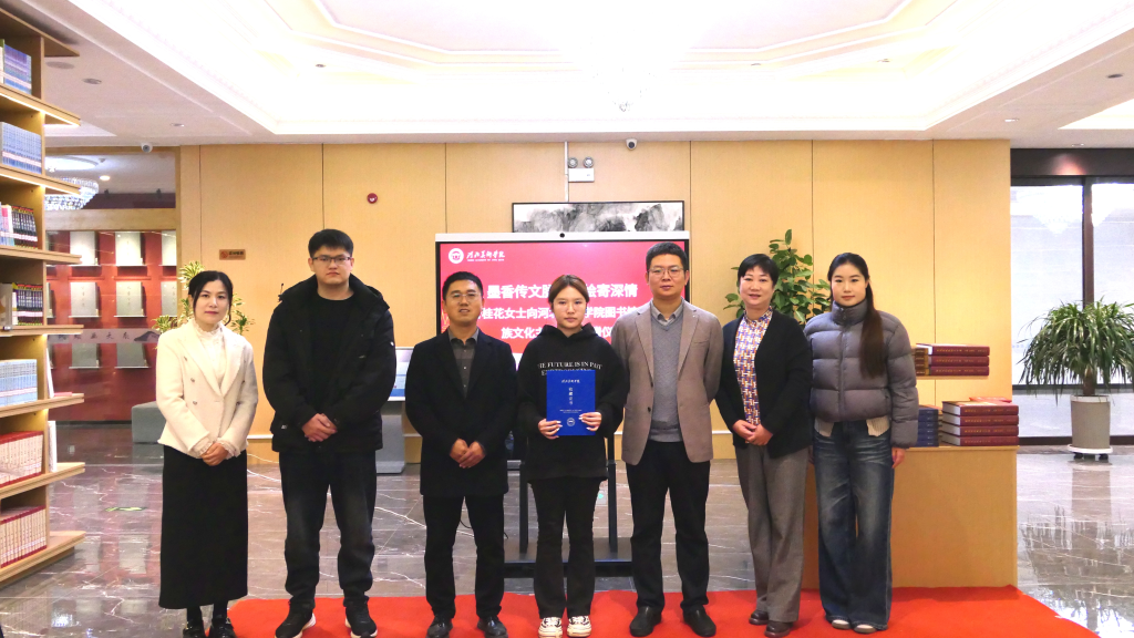 2025年11月7日上午,“符桂花女士黎族文化主题图书捐赠仪式”在河北美术学院图书馆举行。捐赠人符桂花女士委托书法学院大一学生宋阳代为出席,书法学院副书记张政良、设计学院教授唐景词、图书馆馆长李世新及书法学院师生代表共同见证此次捐赠仪式。符女士是通过我校设计学院唐景词教授介绍下捐赠的图书,唐景词全程参与和见证了捐赠仪式。仪式由图书馆老师白莉主持。