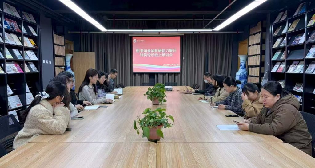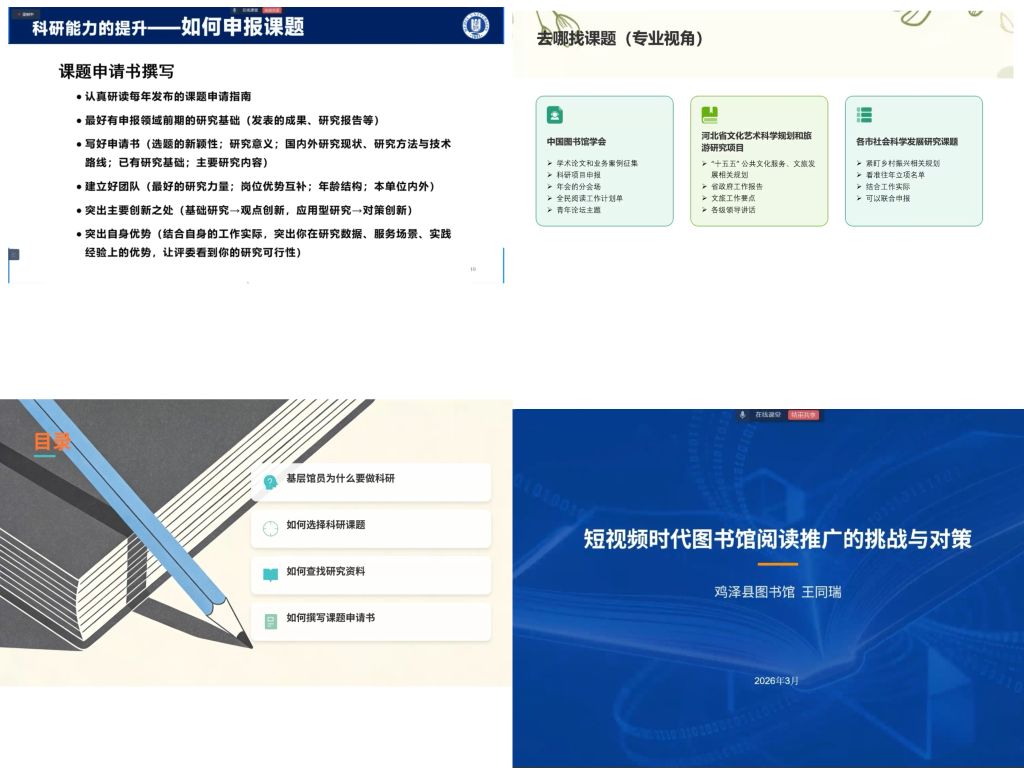 为提升馆员科研素养与课题申报能力,3月27日,河北省图书馆学会举办全省图书馆科研能力提升馆员论坛线上培训会,图书馆组织馆员在二号图书馆报刊区参与学习。